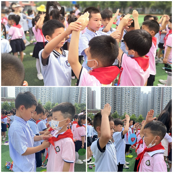 怀揣着对小学的好奇,带着迫切的心情及心中的诸多疑问,西幼娃们走进了小学园,跟着小学老师们的步伐参观了整洁、美丽、有序的校园。校园里的一切都让西幼娃们感到新鲜,挺拔的树、高大明亮的教学楼、宽阔的操场、优美整洁的校园,他们努力寻找小学与幼儿园的不同之处,迫不及待想去看看校园里的每一处风景。随着课间操音乐的响起,西幼娃们在老师的带领下,来到操场看到哥哥姐姐们自信又神气的样子,无不让西财娃们投以羡慕的目光。红领巾是少先队员的标志,它代表红旗的一角,哥哥姐姐们亲手为西幼娃们系上红领巾。