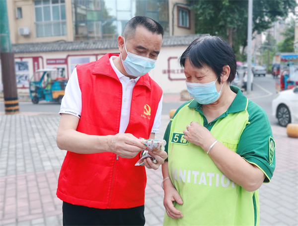 党员志愿们面对面宣传夏季卫生健康常识及常见病、多发病的预防知识,并免费发放防暑降温药包,为群众送去夏日的清凉。