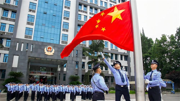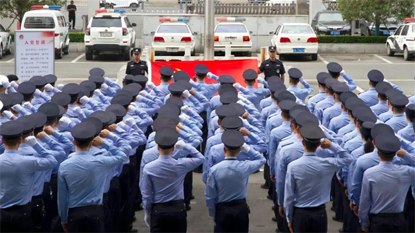 2022年7月1日9时整,精神抖擞的护旗手迈着整齐的步伐,护卫国旗入场。全体人员行注目礼,伴随着激昂嘹亮的《中华人民共和国国歌》,国旗冉冉升起,全体民警警容严整,庄严肃立,向国旗敬礼。