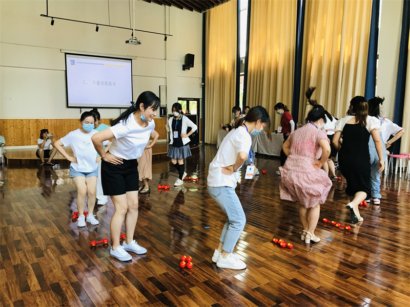 随后,大丰分园教研组长艾雪妮老师带领老师们进行了现场编排,自成小组、自选音乐与器械,进行合作创编。每组老师们都积极进行商讨,按照器械操的科学编排流程,最大限度地开发器械的特点,创编出符合幼儿身心年龄特点的器械操。