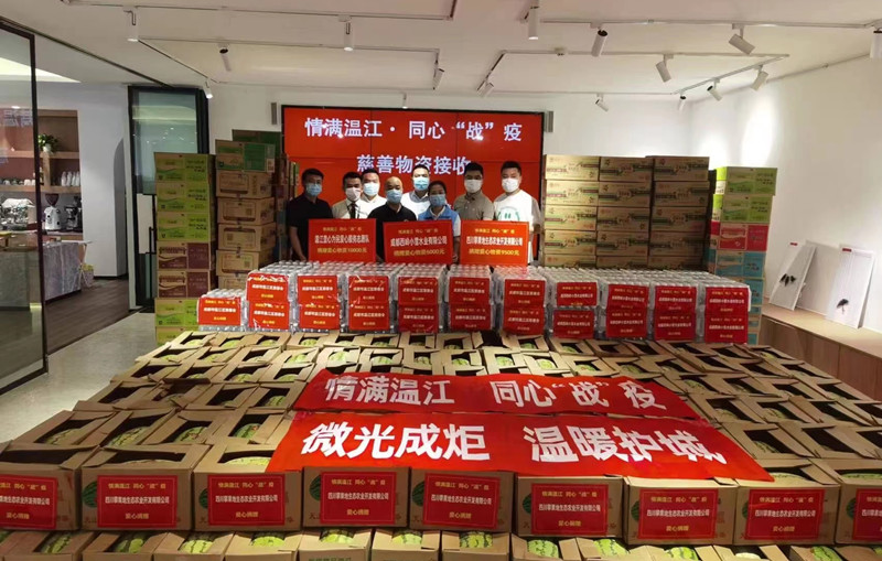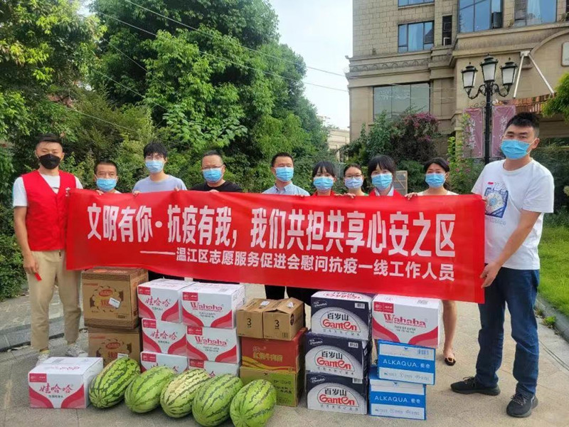 四川新闻网成都7月24日讯 核酸检测点位旁,一堆堆西瓜摆放整齐、一箱箱矿泉水带来清凉……这是近日发生在成都市温江区的暖心一幕。由温江区文明办牵头,区慈善会、区志愿服务促进会联合多家爱心企业,为一线抗疫人员送去关心和慰问。“一线的抗疫人员一直在为我们的健康保驾护航,作为一家本土企业,我们只想尽一点绵薄之力,给他们送来清凉和问候”,参与活动的企业表示,希望通过实际行动践行互帮互助、共担共享的文明风尚。