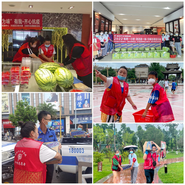 当天上午,邛崃市新时代文明实践中心的大厅里人群忙碌,爱心企业代表和志愿者们,正在加紧整理矿泉水、西瓜、防暑礼品袋等物资,满满的爱心物资,装满了邛崃市民对一线工作人员的敬意。100件矿泉水、500余斤西瓜、100份防暑礼包装车完毕后,志愿者们分组前往桑园镇、中医院、高速卡口、交警队、文君街道等区域,将物资送到防疫一线工作者手中。