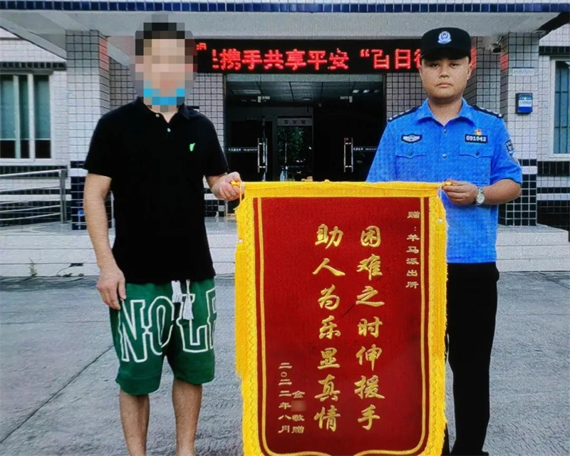 2022年8月12日,羊马街道居民金先生将一面印有“困难之时伸援手 助人为乐显真情”的锦旗送到了羊马派出所值班室,以感谢民警及时帮助他找回遗失的手机。