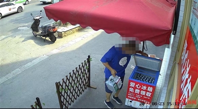 监控画面显示,当晚21点左右,一位白衣男子走到冰柜前,从里面拿了一瓶冰水,咕噜咕噜地喝了一大口,然后回到路边的车上,打开后备箱,从里面提了一箱矿泉水放到爱心冰柜旁边,随后返回车内离开。