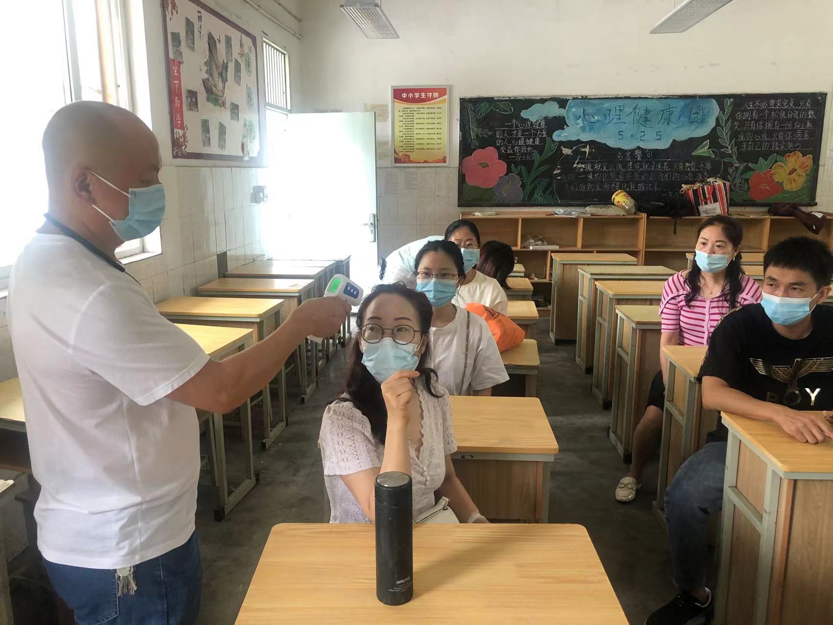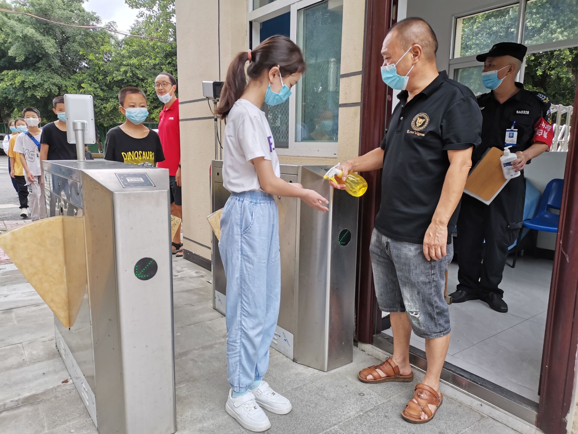 演练正式开始,保安在校门维持秩序,引导学生按照间隔1米的要求分三个通道排队入校,检查学生是否佩戴口罩并携带健康资料,扫场所码,为学生进行体温检测初检。部分老师分别在食堂、教室和学生寝室进行了演练。