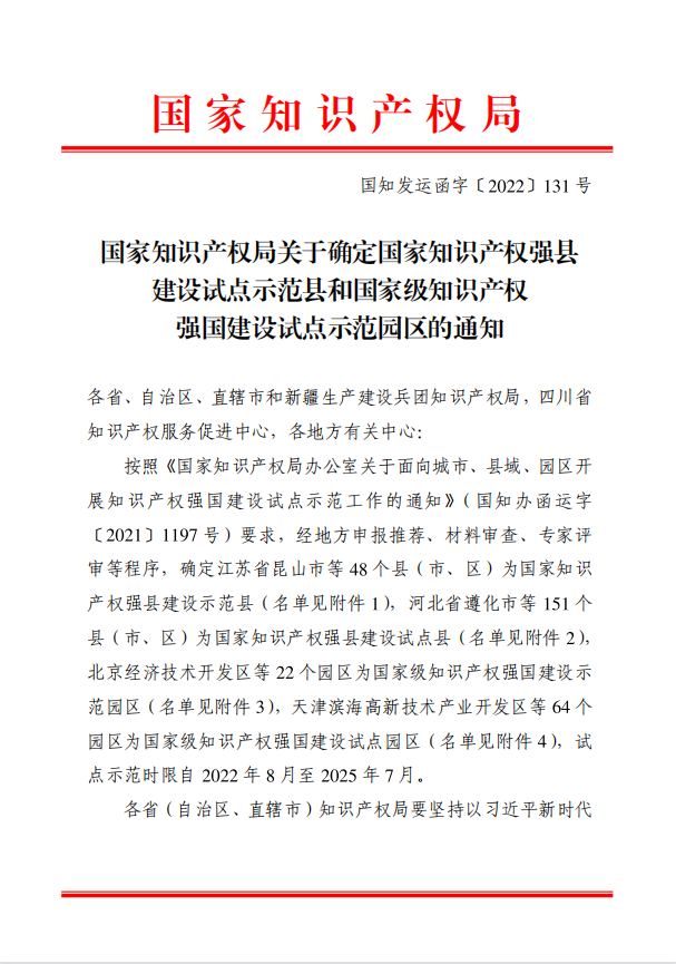 四川新闻网成都9月1日讯 8月29日,国家知识产权局发布《关于确定国家知识产权强县建设试点示范县和国家级知识产权强国建设试点示范园区的通知》(国知发运函字〔2022〕131号),金牛区榜上有名,首批入选强县建设试点县名单。