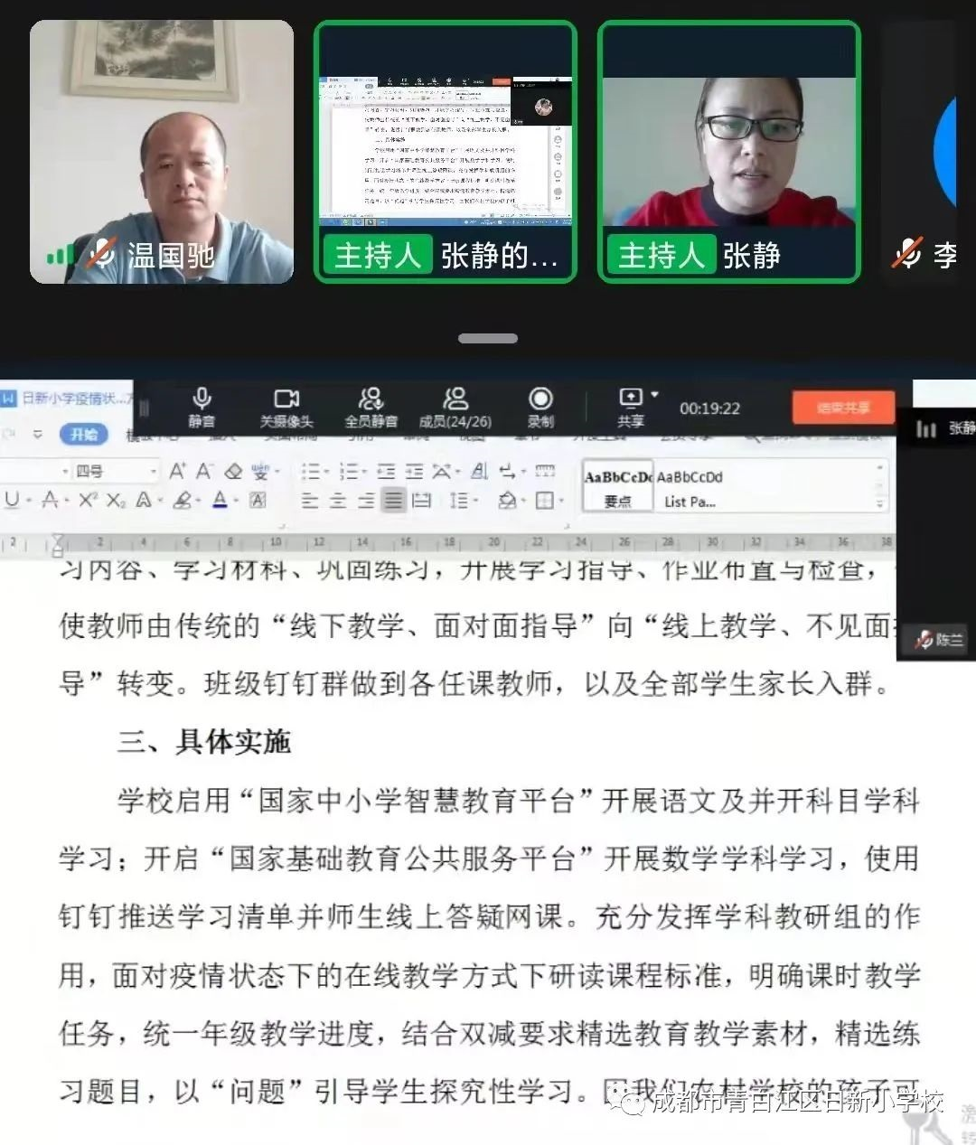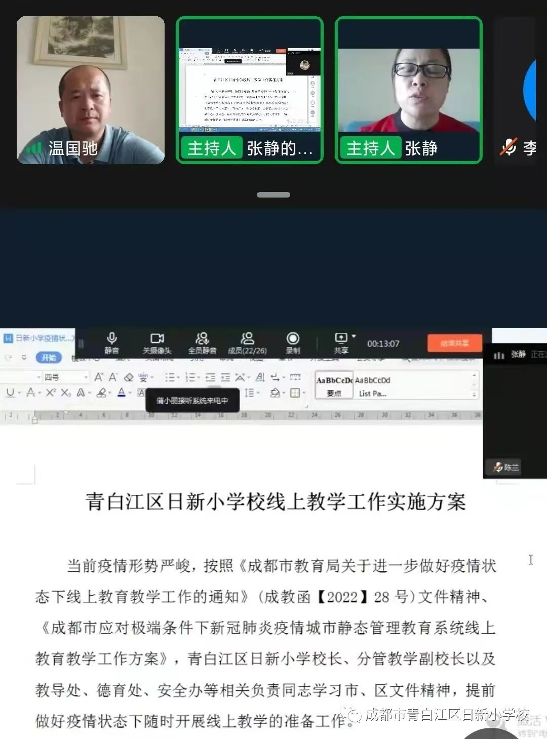 四川新闻网成都9月5日讯 疫情形式严峻,按照《成都市教育局关于进一步做好疫情状态下线上教育教学工作的通知》(成教函【2022】28号)、《成都市应对极端条件下新冠肺炎疫情城市静态管理教育系统线上教育教学工作方案》等相关文件要求,为更好地服务学生居家学习成长,促使教师由传统的“线下教学、面对面指导”向“线上教学、不见面指导”转变,青白江区日新小学校长温国驰、分管教学副校长王友成以及教导处、德育处、安全办等相关负责同志制定了《青白江区日新小学校线上教学实施工作方案》,并于2022年9月1日下午召开了全体教师线上教学培训会议。