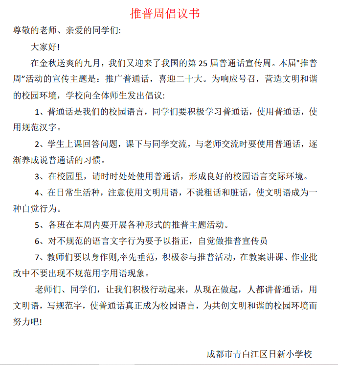 语以规而论事,言以范而律人。青白江区日新小学校将充分发挥学校的载体作用,在日常教学中落实普通话宣传,在国学经典展演等活动中讲好普通话!(邓林钢)