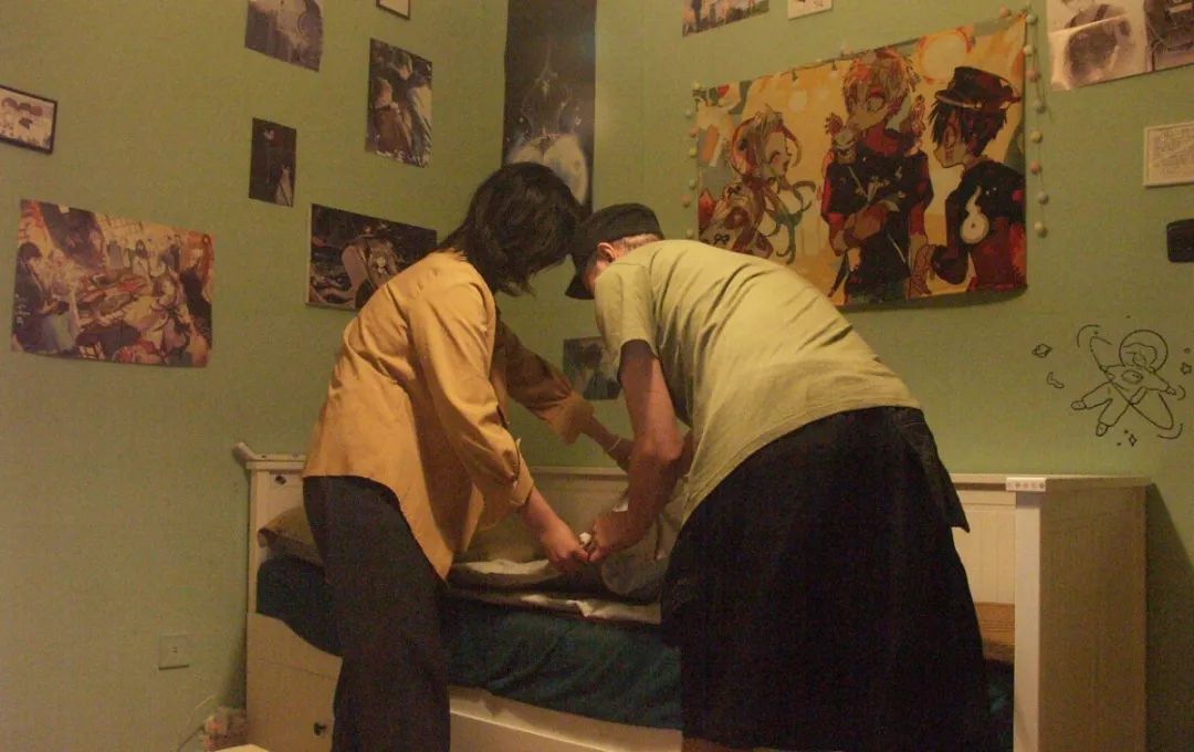 和爸爸牵着四个被角,一起将皱巴巴的被褥舒展