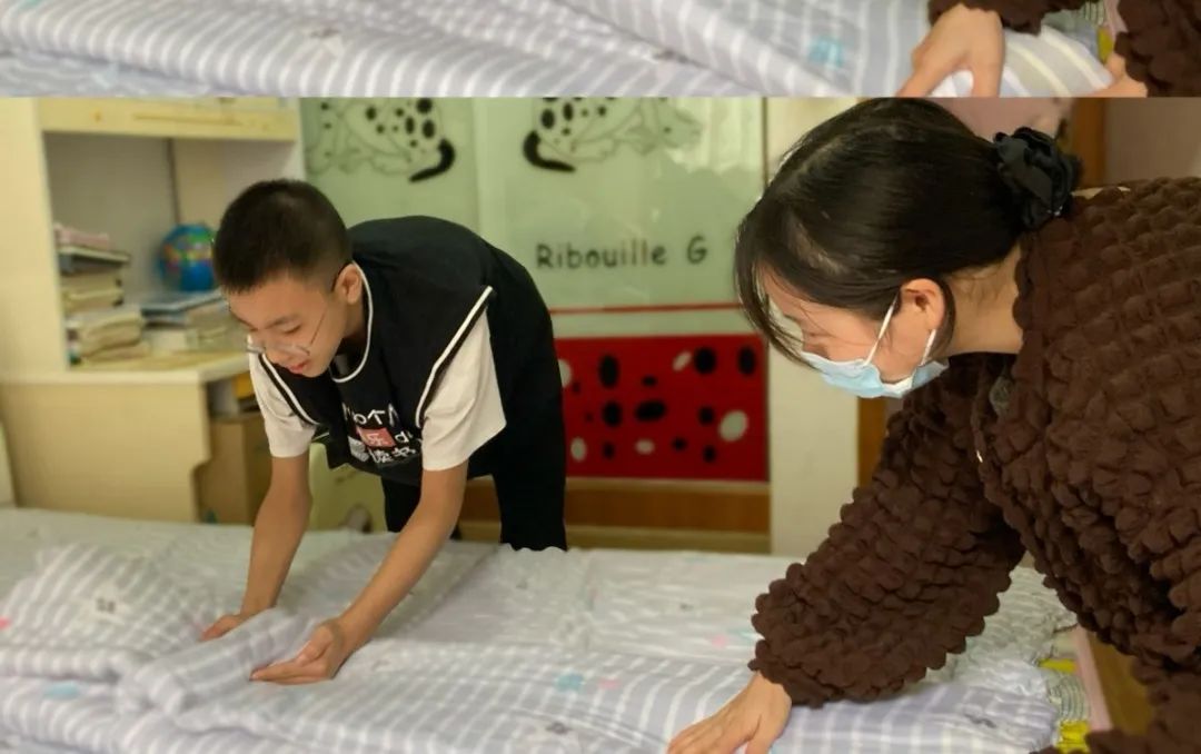 和妈妈细心研究,努力向“豆腐块”式叠被法靠近