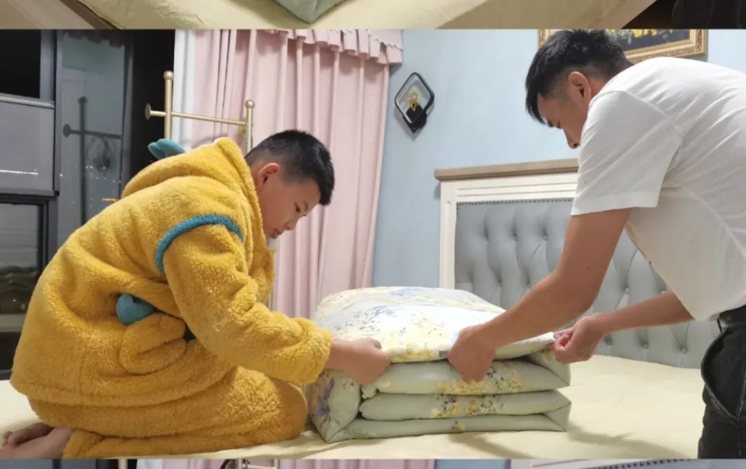 和爸爸妈妈来到稍显凌乱的床铺前,有的孩子信心满满,有的孩子摩拳擦掌,有的面露难色。不管如何,一样的是,一家人共同合作时的快乐。