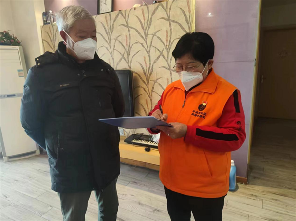 ▲楼栋长李淑彬带着志愿者上门为居民提供服务