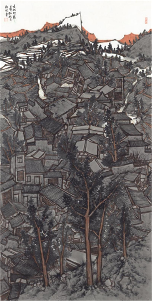 “邛崃,一座让人忘不了的城市。”江苏画家靳闯曾于多年前与好友游玩途径邛崃,邛崃的秀丽山川和保存完善的古迹给他留下了深刻的印象,而他也将此情此景注入到了国画作品《古城印象》当中,通过山川、古宅、田地、树木等将邛崃的自然景观和人文相结合,体现出邛崃深厚的历史文化积淀和绿水青山的自然之美。