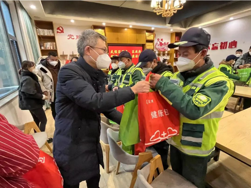 2022年12月30日,武侯区领导带队,行业主管部门牵头,深入一线走访,在为保供人员发放“健康包”的同时,还送上了来自区委区政府的慰问信。