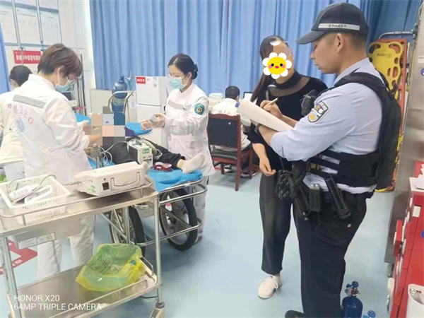 “跟着我们警车走”,一路上警笛急鸣、警车飞驰,仅用短短两分钟时间,吴兴贵和朱刚便驾驶警车将患者安全护送至大邑县人民医院急诊室。由于患者手脚抽搐蜷坐在出租车副驾驶位置不能动弹,两名急诊医护人员推来担架后却无从下手,吴兴贵见状,喊了句“我来”,给患者来了个“公主抱”,将该患病男子从出租车副驾驶直接抱出,轻轻放在担架上,医护人员立即将其推进急诊室。