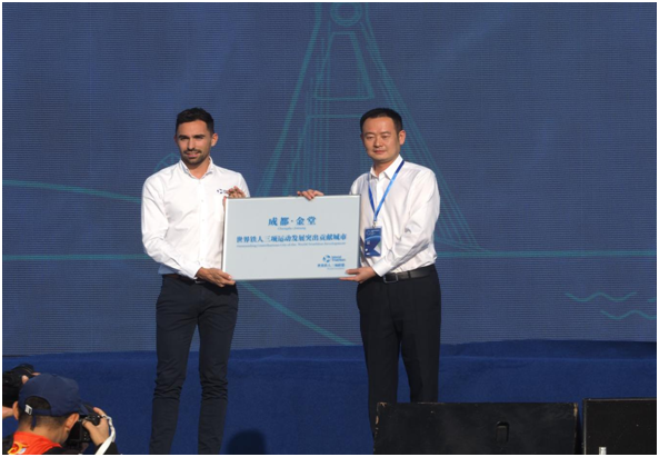 四川新闻网成都10月18日讯 10月14日,“甘御兰杯”2023成都金堂铁人三项世界杯赛暨成渝双城铁人三项公开赛在金堂国际铁人三项赛场开幕。开幕式上,世界铁人三项联盟执委会代表塔码斯·陀斯向中国铁人三项运动协会、成都市体育局颁发突出贡献奖杯,向金堂颁发“世界铁人三项运动发展突出贡献城市”奖牌。