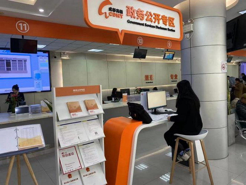 街道工作人员在桂溪街道政务大厅发放政策汇编