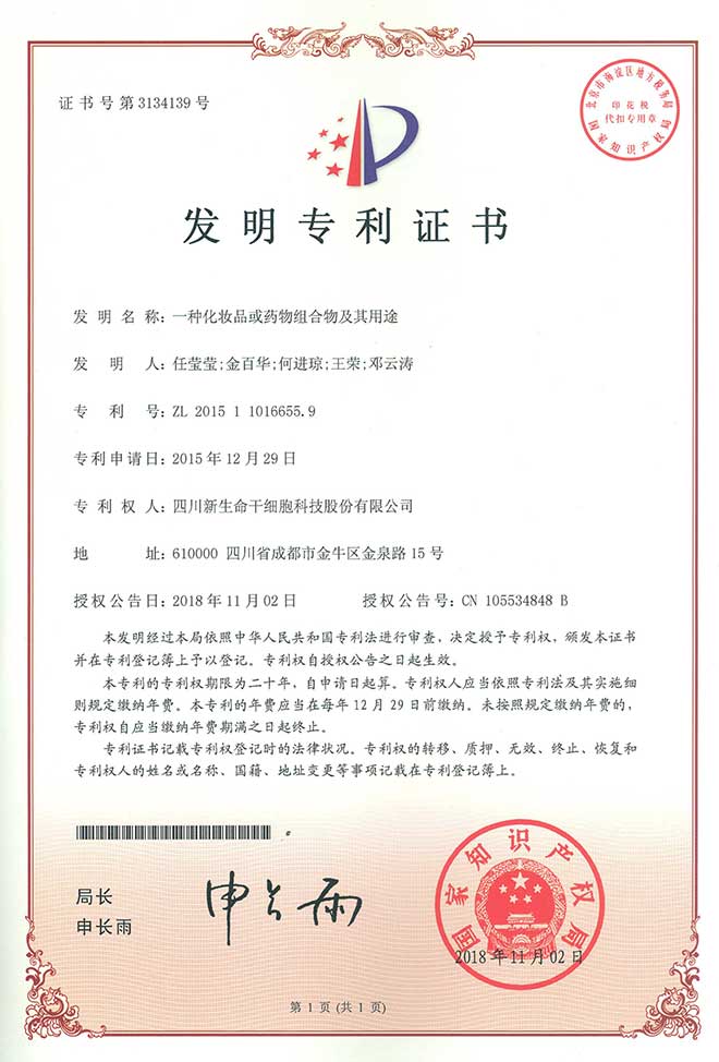 四川新闻网成都2月14日讯 近日,四川新生命干细胞科技股份有限公司申请的“一种化妆品或药物组合物及其用途”正式获得国家知识产权局发明专利授权(以下简称“化妆品或药物组合物专利”)。同时,在以往技术累积的基础上研发的“多肽焕颜面膜”现已经上市。