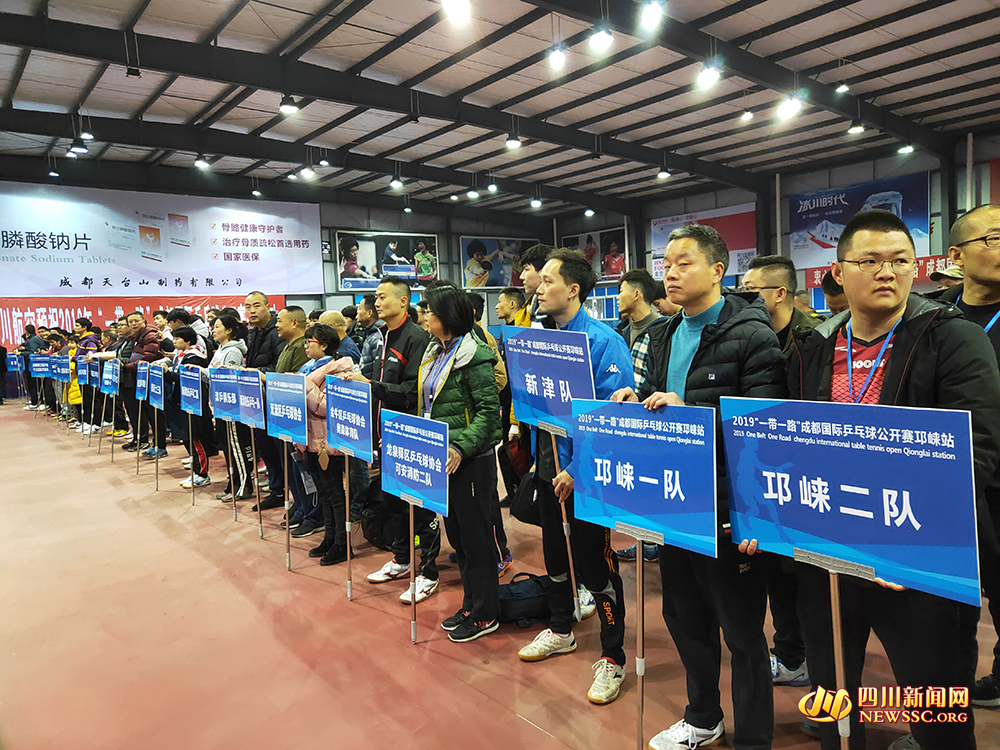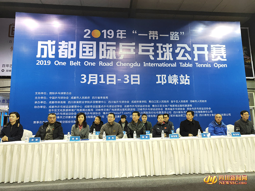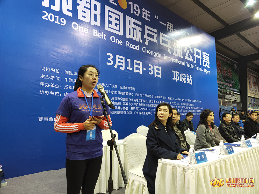 3月2日上午9点,2019 年 " 一带一路 " 成都国际乒乓球公开赛开幕式在邛崃市体艺健身中心乒乓球馆如期举行,中国乒乓球协会、四川省乒乓球协会、四川体育学院、成都市乒乓球运动管理中心、成都市体育局、邛崃市相关领导和嘉宾出席开幕式。开幕式上邛崃市相关领导致欢迎辞,中国乒乓球协会副主席、四川省乒乓球协会主席高亚翔先生致开幕辞,裁判员代表和运动员代表宣誓后,由成都市乒乓球运动管理中心主任、成都市全国重点乒乓球运动学校校长陆世义先生宣布比赛正式开始。