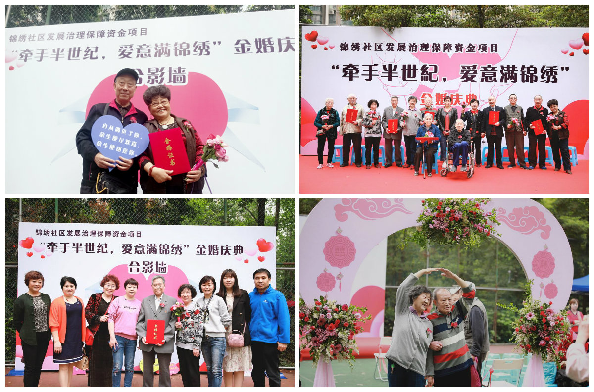 四川新闻网成都4月19日讯 中华民族崇尚夫妻和睦、白头偕老的美满爱情。50年岁月沧桑,记录下多少爱的故事。2019年4月18日,由跳蹬河街道锦绣社区两委主办的“牵手半世纪,爱意满锦绣”金婚纪念庆典活动在锦绣东方小区举行。