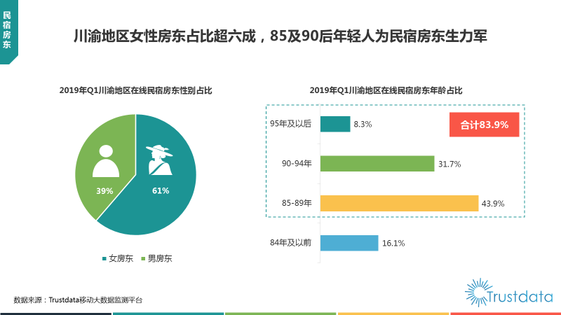 榛果民宿业务数据显示,截止2019年2月,成都的女性房东占比高达6成以上,44%的房东都在30岁及以下,这些颇具成都特色的“女老板”和“年轻人”为城市民宿行业带来了更多“成都生活味”。