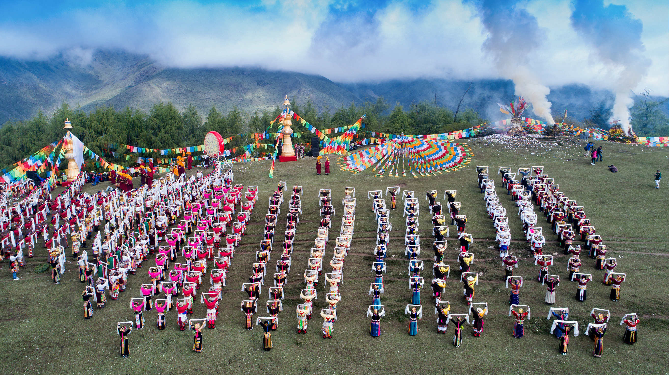 盛世朝山,歌舞太平,在圣洁巍峨的神山注视下,朝山坪盛大的传统朝山仪式将震撼举行,数万名藏族群众身着节日盛装,手捧哈达,成群结队来到四姑娘山朝山坪,用传统的仪式和欢乐的民族歌舞,向斯古拉神山转山祈福,祈求风调雨顺、五谷丰登、六畜兴旺、国运昌盛。