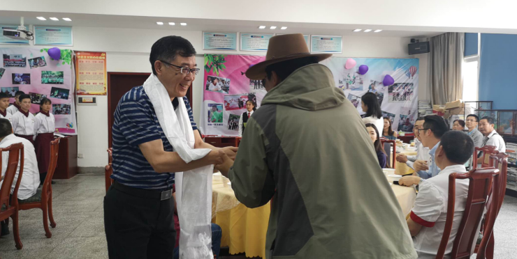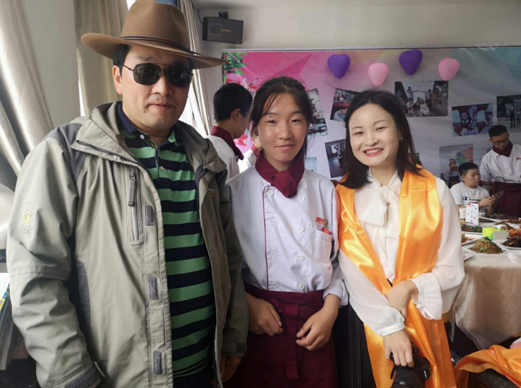 李锦记希望厨师白玛诺措家长向财贸校、李锦记赠送哈达,表达谢意