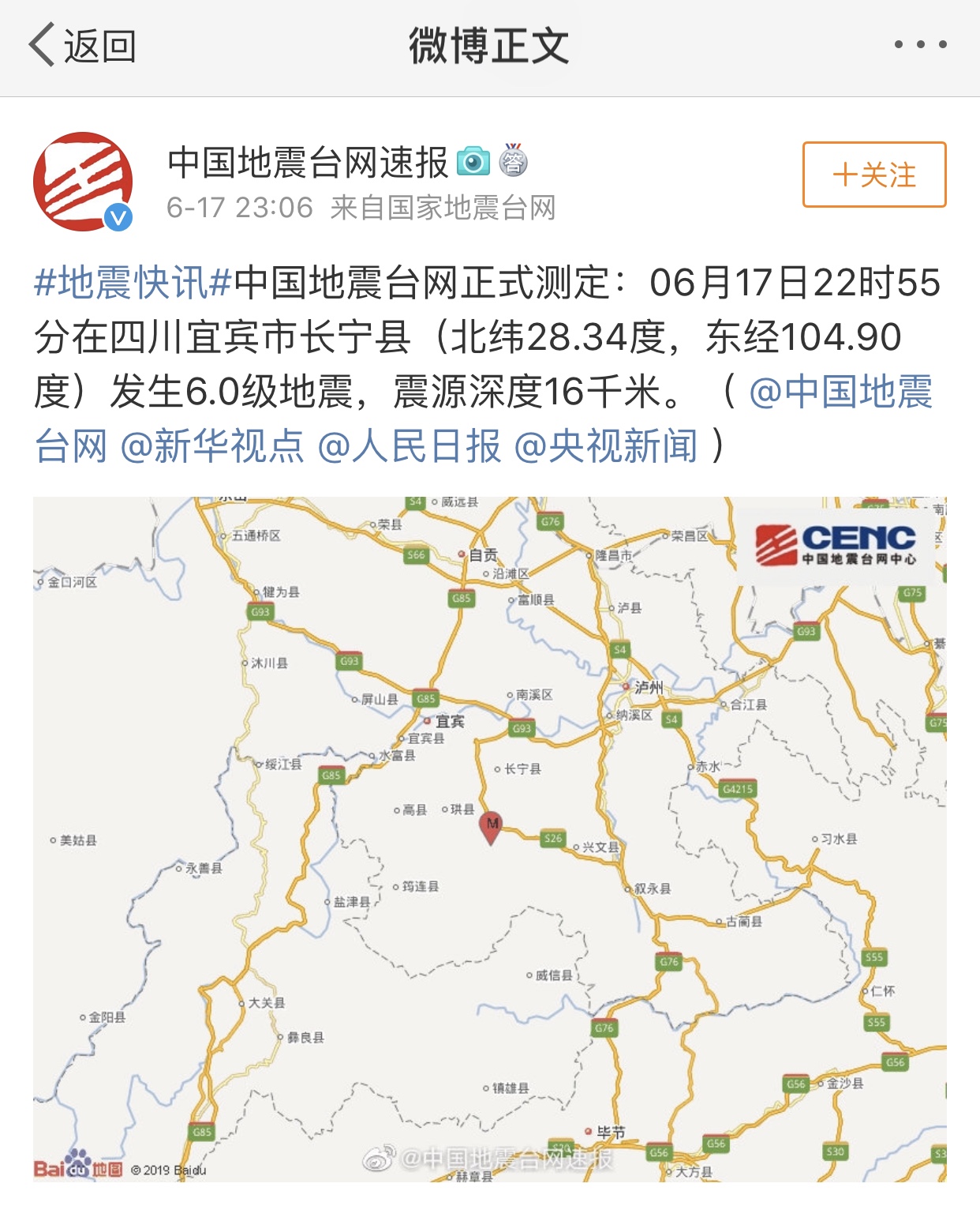 四川新闻网成都6月17日讯(记者 郭晓彤)中国地震台网正式测定:06月17日22时55分在四川宜宾市长宁县(北纬28.34度,东经104.90度)发生6.0级地震,震源深度16千米。朋友圈、微博被地震的消息刷屏,成都多名网友表示,震感明显,也听到了社区警报铃声。