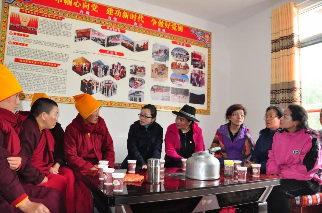 为了解藏区妇女生产生活及创业就业、家庭文明建设等情况,郑备一行先后在甘孜县斯俄乡吉绒隆沟集中安置点、格萨尔文化精准扶贫暨百村产业基地、白玉县和道孚县觉姆寺庙、甘孜州妇女手工产品展卖点等地进行了调研。