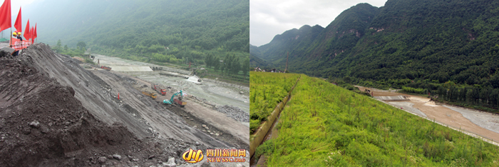 这是记者在什邡市蓥华镇穿心店磷石膏堆场所在位置分别于2017年6月、2019年7月(后)拍摄的照片。(卢永洪 摄)