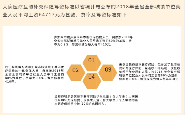 缴费基数是全省全部城镇单位就业人员平均工资。大病医疗互助补充保险筹资标准以省统计局公布的2018年全省全部城镇单位就业人员平均工资64717元为基数。打个比方,举个例子算一下:64717×80%×0.8%=414.1888,四舍五入就是410元,大病的筹资标准就是这么来的。