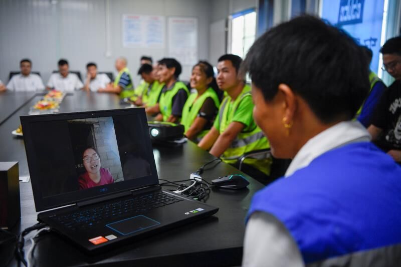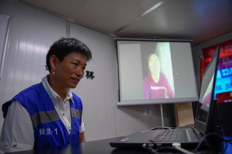 第一个上阵的是中年妇女陈富贵,四川射洪县人,她是项目上的保洁员,丈夫在项目上当保安,在外打工20多年,在中建项目工作3年多了,因两个女儿均出嫁,夫妻两3年没有回家了。她端坐在电脑前,和远嫁西藏的大女儿聊开了,“今天项目上给我们放了半天假,提前过中秋节,还发了一盒月饼,好热闹哦。”“妈,你和爸都要保重,不要太累了哈。” 陈富贵含泪点头,“今年过年回家我们好好耍一耍。”