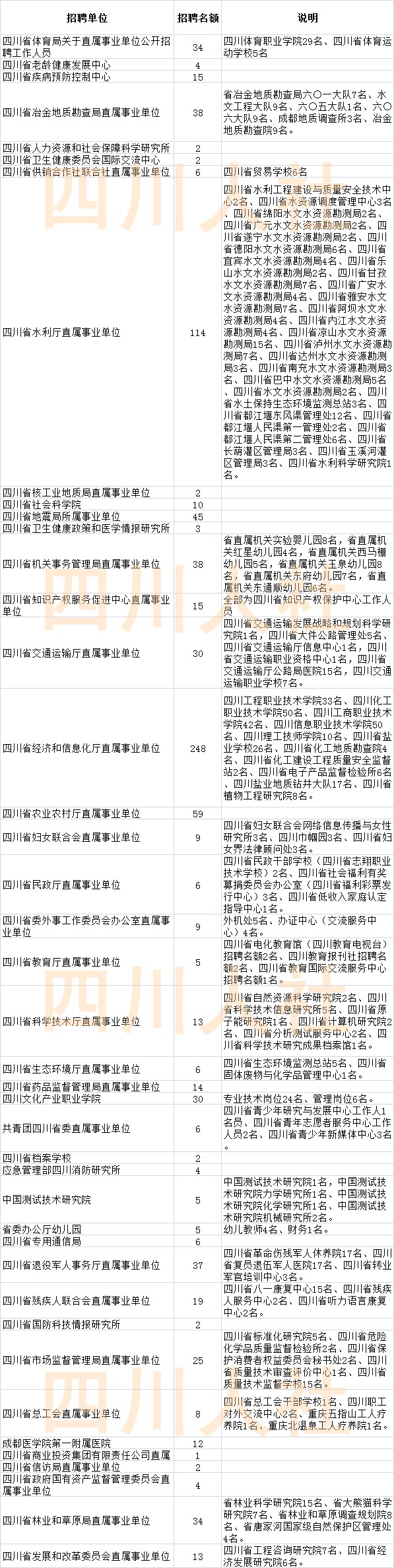 从招聘单位和名额来看,四川省体育局直属事业单位将公开招聘工作人员34名、四川省冶金地质勘查局直属事业单位将公开招聘38名、四川省水利厅各直属事业单位总将公开招聘114名、四川省经济和信息化厅直属事业单位将公开招聘248名等。公告详情见四川省人力资源和社会保障厅官网(http://rst.sc.gov.cn/)“人事考试”专栏。