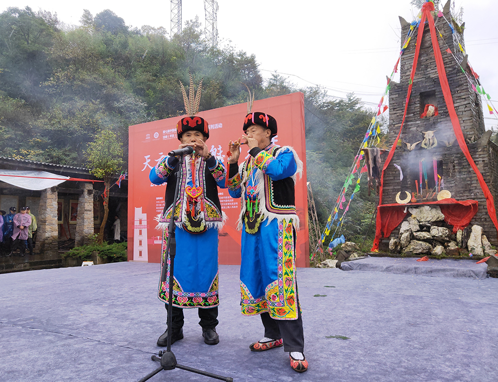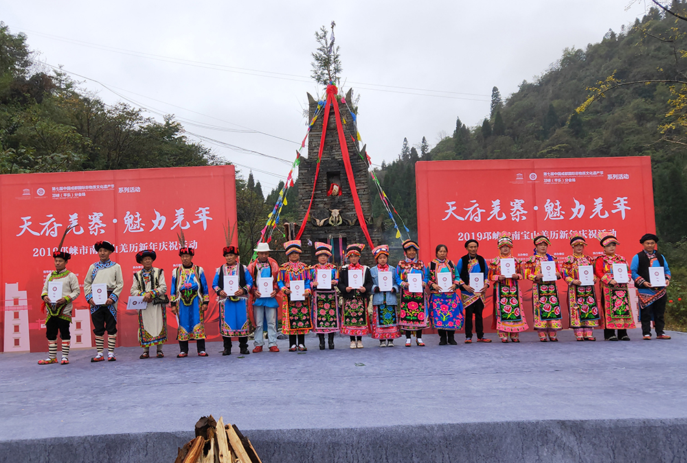 10点20分,热情的羌族同胞为来宾和游客献上了炙热的羌红。在一阵吆喝和鼓声震天的热烈气氛中,身披羊皮袄、手持羊皮鼓的队伍走进了人们的视线,“羌笛演奏及制作技艺”、“羌族沙朗”、“羌族羊皮鼓舞”、“羌族刺绣”、“羌年”等市级非遗代表性项目代表性传承人队伍活跃了现场氛围。在释比老人一连串的羌族祝福语中,传统祭祀展演拉开了活动的序幕。《夯出幸福来》《惹红特》《开坛祈福》《五谷丰登》等羌风歌舞,艺术化地展现了羌家儿女日常生活,也表现出了羌族同胞在节庆仪式中的文化传承。活动现场还为20名第六批邛崃市级羌族非遗项目代表性传承人颁发了证书,他们将担负起羌族非物质文化遗产传承的使命和责任。