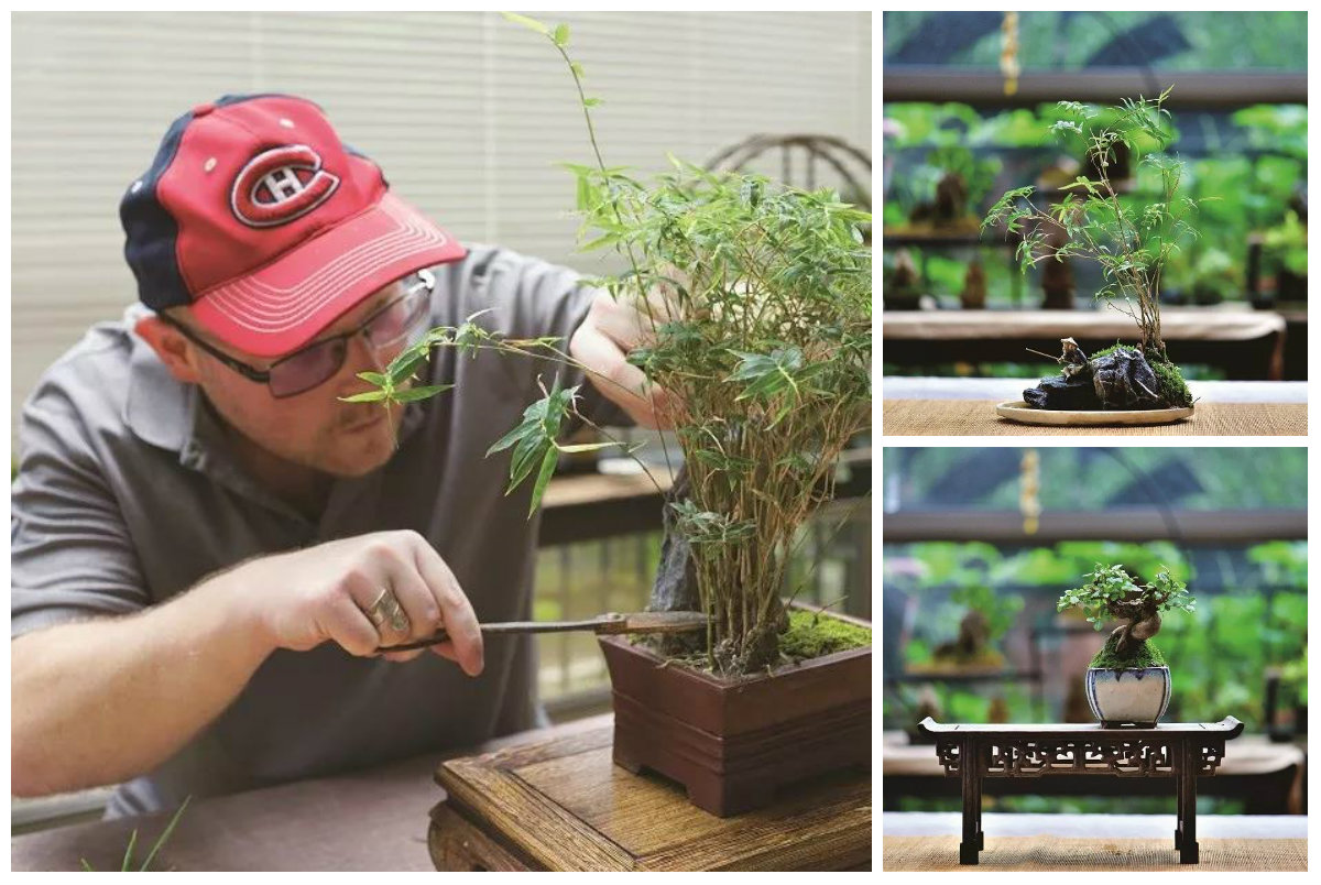 没有太多的社交,白熊有了更多的时间进入盆景的世界。在加拿大时,他主要制作日本盆景。自从在成都百花潭公园见到川派盆景后,他有了一个疑问,川派盆景在四川有这么大群体的爱好者,为什么在国际盆景界少有看到相关的资料?于是,他有了一个想法,将自己的盆景创作理念与川派进行融合,然后向西方介绍川派盆景。