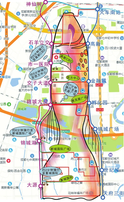 成都地铁运营有限公司客运管理部相关负责人比喻,5号线和1号线就像锦鲤的背脊和鱼腹,而架在这之间的公交线路,好比是支撑起这条锦鲤的骨架。“每条骨架上,还往各个方向延伸出不少的小‘鱼刺’,其实就是我们的共享单车骑行路线,帮助市民更加灵活地完成出行最后一公里。”