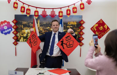 昨日,成都商报-红星新闻记者来到以色列驻成都总领事馆,对潘立文进行专访。辞旧迎新,领事馆的会议室里已经贴上祝贺新春的福字剪纸,桌上备着鹰嘴豆酱、饼等以色列传统食品,以及笔墨与红色的斗方纸。
