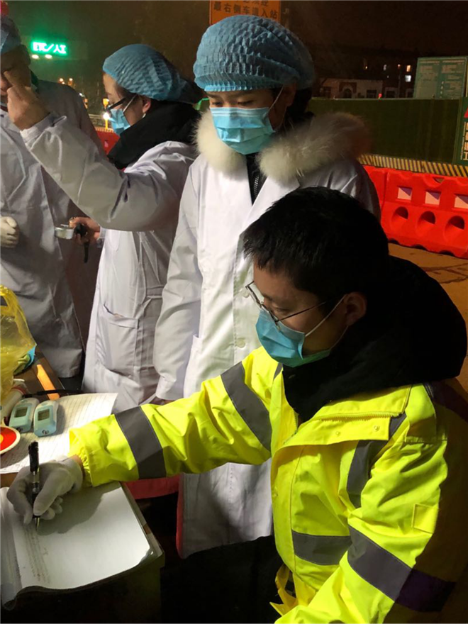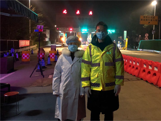 同安社区卫生服务中心护士杜渝与交通运输发展服务中心职工谢程毅是新婚夫妻,今年春节,他们本来和父母约好要回重庆筹备婚礼。但疫情发生后,他们都放了父母的鸽子,回到工作岗位,积极加入到疫情防控第一线。1月27日深夜,主动申请通宵值守的杜渝与丈夫谢程毅在成渝高速阳光城出口再一次相聚。丈夫逐一排查过往车辆,配合妻子测量车上乘客的体温,并对外地车辆进行登记。当看到对方累得微闭双眼时,他们就互相给对方加油鼓劲,一起坚持下去。