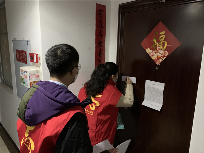 “我参加!”魏家街社区一名来自气象局预报科的双报到党员杨柳同志主动申请加入社区志愿者队伍。一连几天,她同社区工作者一道,入户为居民发放《致市民朋友的公开信》,在未联系到的居民家门口张贴《温馨提示》,留下联络方式,提醒外出归来的居民在返程后立即与社区联系,为居民和社区之间搭建快速便捷的沟通桥梁。杨柳的父亲、母亲热心支持社区工作,全家三人齐上阵,这个家庭志愿团共入户排查达700余户。