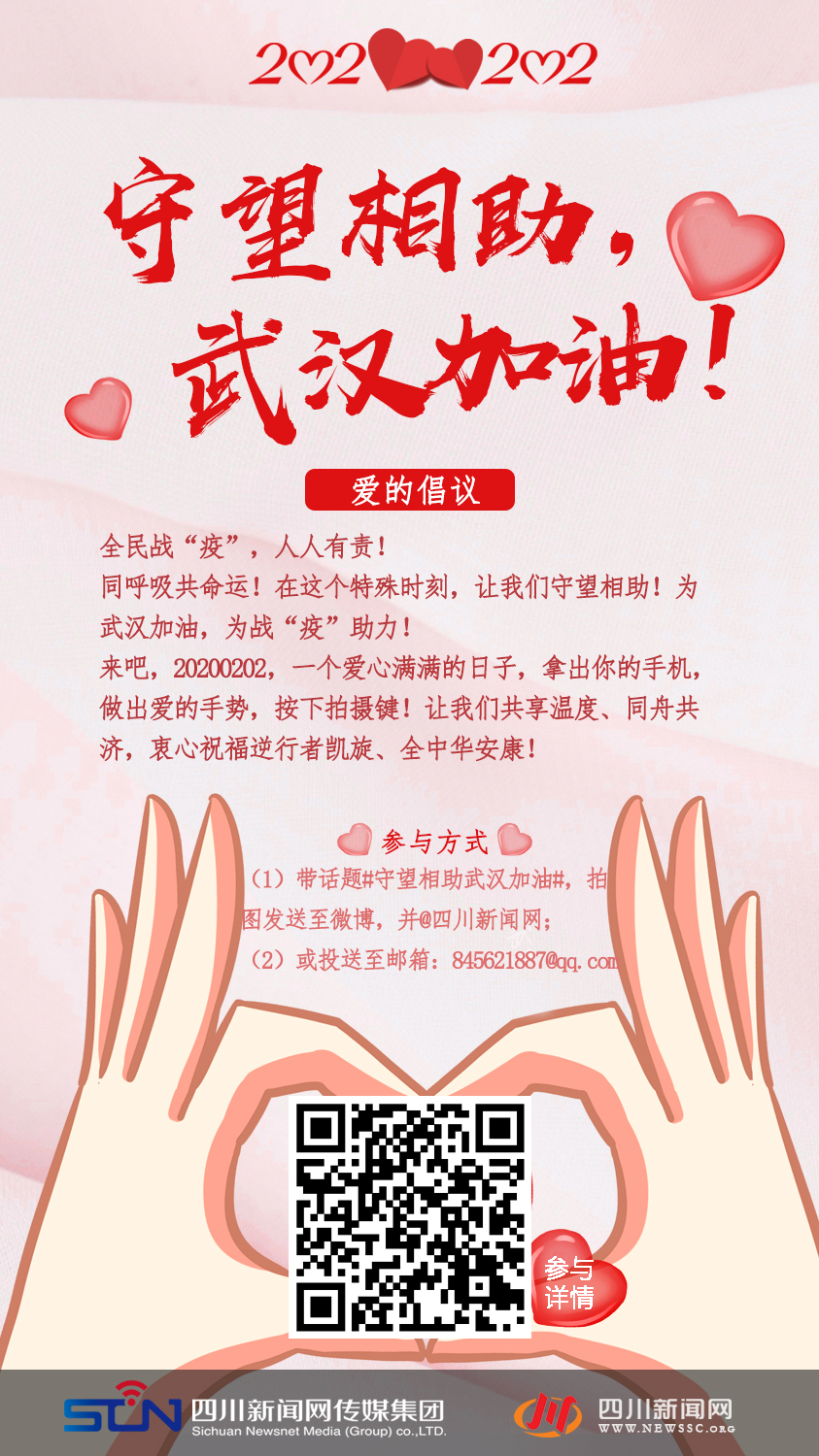 四川新闻网成都2月2日讯(蔡晓慧)2020年2月2日,被网友们赋予了“爱你爱你”的特殊含义。这些日子以来,因为新型冠状病毒感染的肺炎疫情,武汉“封城”全力抗击疫情,四面八方汇集的医护为这座城市带去了力量和温度,全国各地捐献的物资为这座城市送去了支撑和关爱。在这个特殊的日子里,我们还可以做些什么,来为武汉加油?
