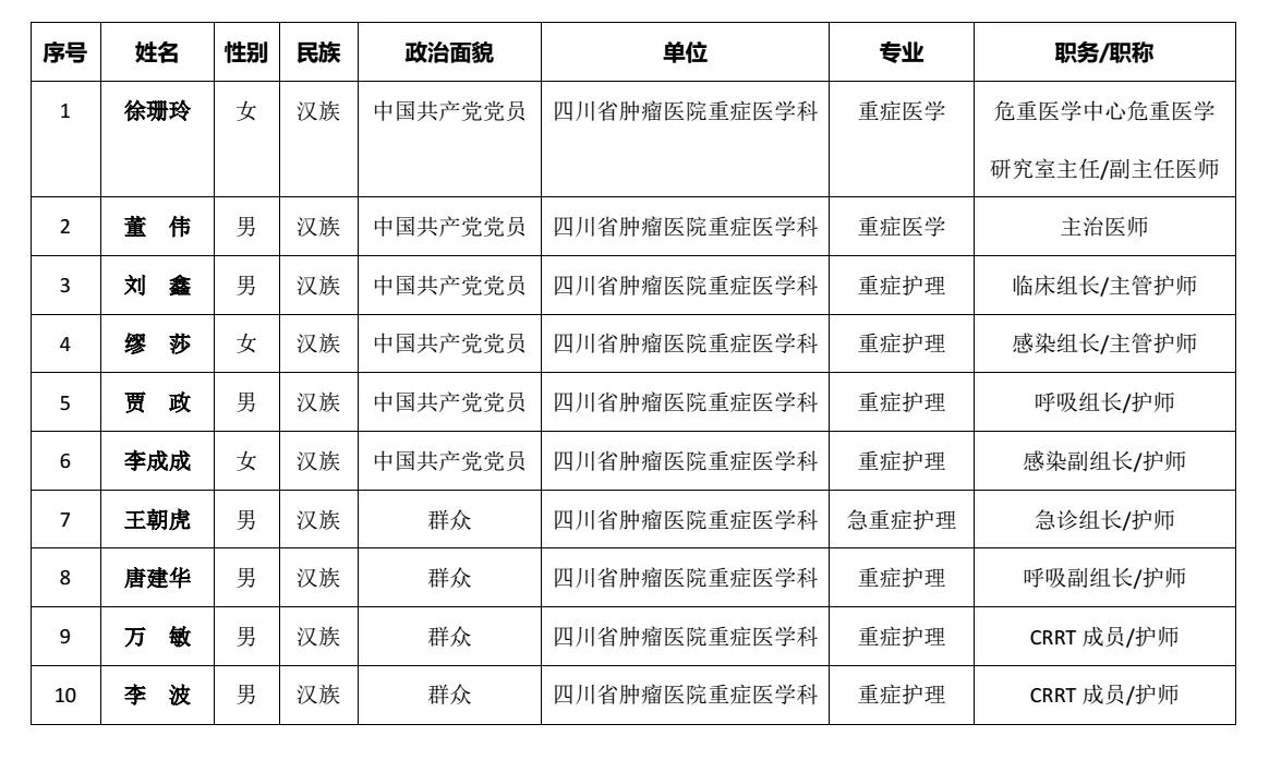 由该院危重医学中心危重医学研究室主任徐珊玲带领10人组成的援鄂医疗队成员均来自于 四川省肿瘤医院重症医学科,2名医生,8名护士,其中中共党员6人。出发前成立了四川省肿瘤医院援助湖北医疗队临时党支部:徐珊玲同志任党支部书记、刘鑫同志任组织委员、缪莎同志任宣传委员。缪莎同志1岁多的孩子已生病一周多,但她依旧义无反顾上前线,孩子只能托给同在同院上班的丈夫和家人照顾。