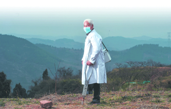陈永根医生拄着拐杖,一次次往返在山路上为村民普及防疫知识