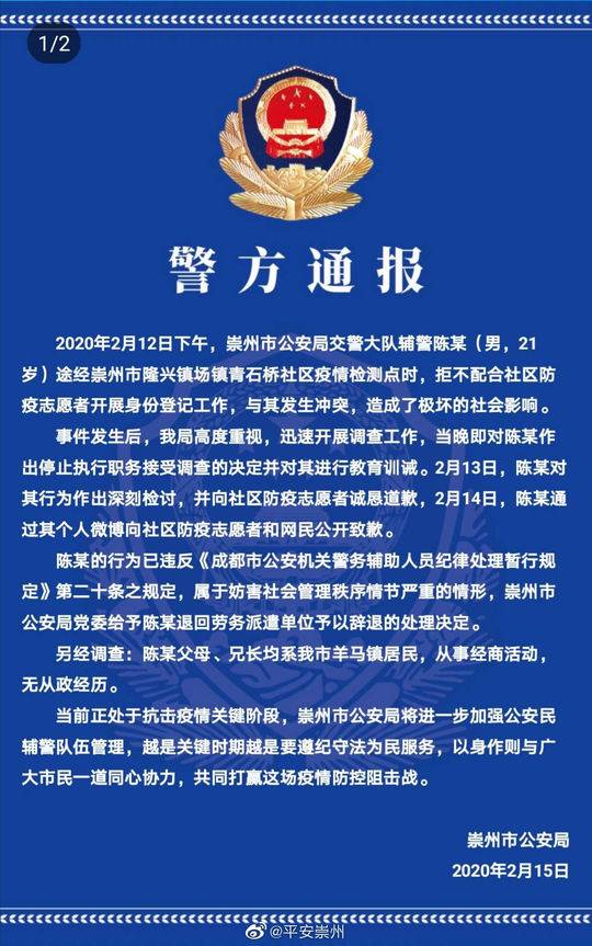 2月12日下午,崇州市公安局交警大队辅警陈某(男,21岁)途经崇州市隆兴镇场镇青石桥社区疫情检测点时,拒不配合社区防疫志愿者开展身份登记工作,与其发生冲突,造成了极坏的社会影响。