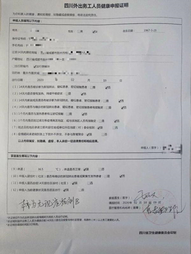 四川新闻网成都2月19日讯(记者 漆奇)“真的是又快又方便哦!”2月18日一早,不到10分钟时间,家住彭州市桂花镇一龙村的尹燕珍就拿到外出务工人员健康证明。她高兴的表示,因为第二天要前往重庆工作,根据要求需要提供健康申报证明,着急的她在桂花镇一龙村居委会和桂花镇卫生院的帮助下,很快就获取了健康证明,马上能返岗工作了。