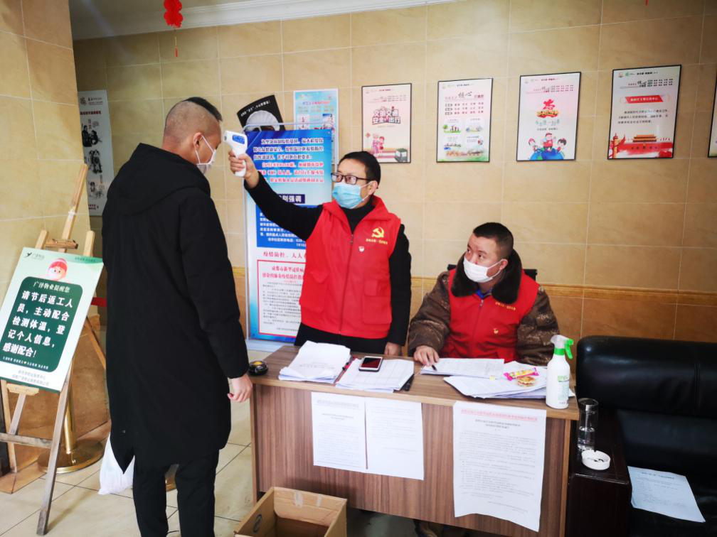 图为炬民律师事务所支部书记刘茂川正在为居民测量体温