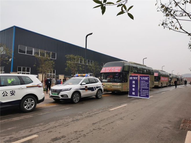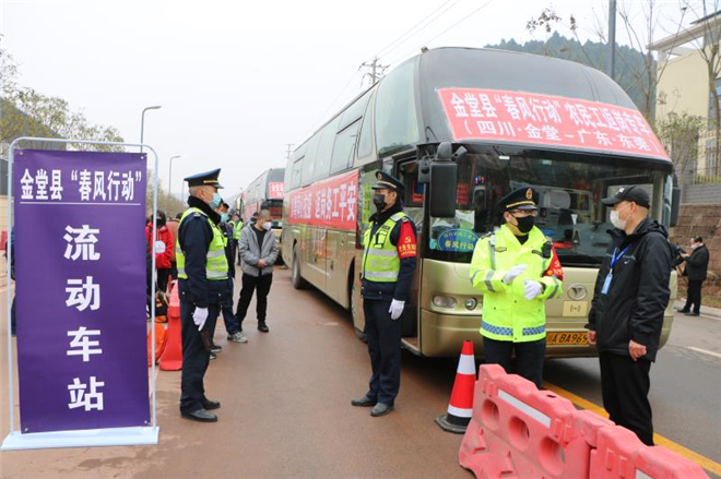 四川新闻网成都2月25日讯(记者 漆奇)2月24日,“金堂县春风行动流动车站”在竹篙镇集中居住区为外出广东东莞务工的农民工开展了首次服务,此次共调派7辆客运车辆,将136名返岗农民工分别运往东莞市几个厂区,预计2月25日抵达目的地,让返岗农民工能够“出家门、上车门,下车门、进厂门”。