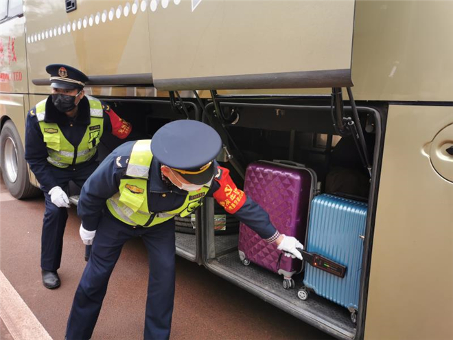 在现场,“流动车站”采用水马围挡隔离出独立的安检、乘车区域,配备足够的交通执法人员和安全管理员,禁止无关人员和车辆进入。交通执法人员指挥农民工通过水马和锥形桶等设施隔离出的独立农民工乘车专用通道进入流动车站。安全管理人员检查了车辆技术状况和车载安全设备是否齐全有效;通过手持安检仪、开箱验视等对乘客行李箱包进行安检,严格禁止携带易燃易爆等危险品上车。督促司乘人员系好安全带、佩戴好口罩,打造安全、规范、有序的乘车环境。