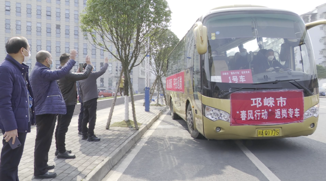 四川新闻网成都2月25日讯 2月24日下午,邛崃市即将前往浙江嘉兴的70名返岗复工外出务工人员,登上了该市“春风行动”返岗专车,分散就座。专车将把他们送往成都车站,登上浙江嘉兴派来的专车。