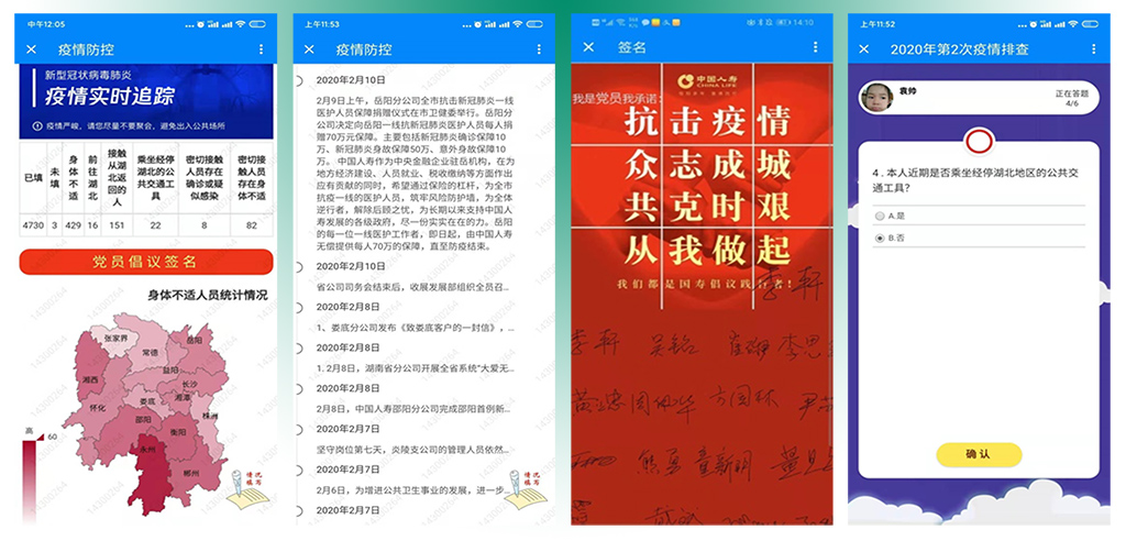 推出“国寿有爱 抗疫有我”线上客户主题活动,为基层销售伙伴提供31款扩展责任产品的客户名单和线上拜访工具,推荐信息110万条;开发客户线上预约系统,打通网销产品销售最后一公里;建立贯穿省、市、县、职场各层级的线上办公流程,疫情期间累计访问8.1万人次,完成线上流转4285件;智能推送图文战报,新增战报205件,推送咨询848781次,使各级人员疫情期间也能够对业务发展情况了如指掌。