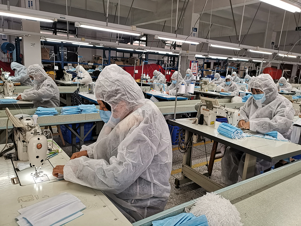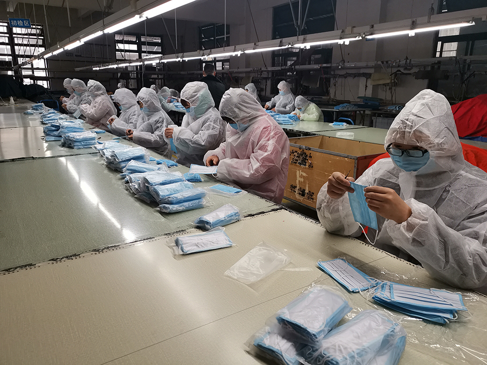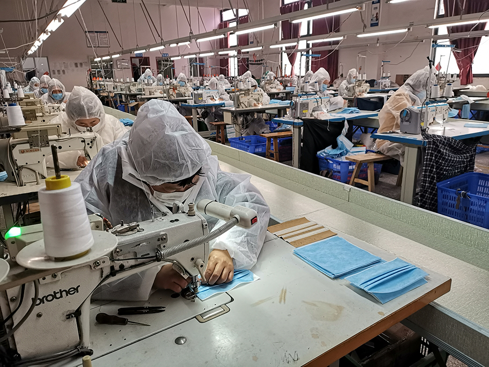 裁剪、缝纫、包装……口罩车间内,佩戴口罩、身着白色防护服的工人们正紧张有序地作业。目前,该公司已形成了日产1万只口罩的产能。从2月17日公司恢复口罩和防护服生产以来,已经生产10万只口罩和30万套防护服等防疫物资。